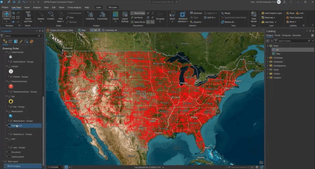 The non-profit organization, MITRE, launched Project Homeland, an initiative to support analysts in mapping hidden connections using advanced GIS technology. Knowing the cascading vulnerabilities throughout the power infrastructure in the US supports analysts in determining the impact of a cyber incident across multiple states and industries, such as healthcare, water treatment plants, and digital networks that communities depend on.