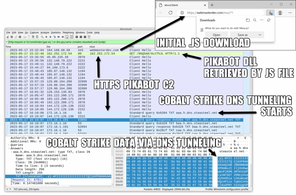 - [various prefixes].dns.steasteel[.]net – DNS traffic: tunneling via replies to DNS queries for this domain. Note: The domain steasteel[.]net was registered on 2023-04-11