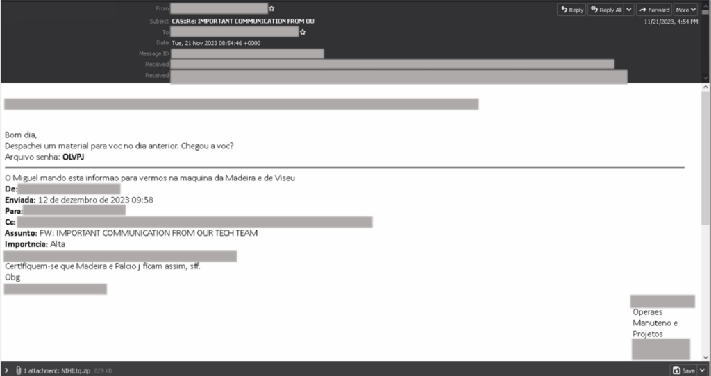 In one case, threat actors were observed using password-protected attachments (such as a JPEG or PDF file) with the password provided in the body of the email.
